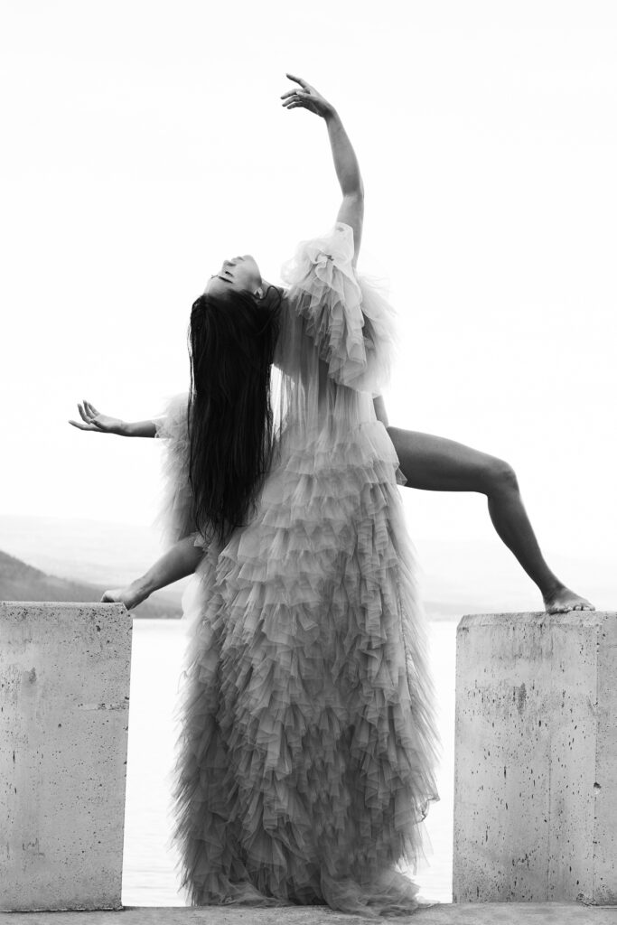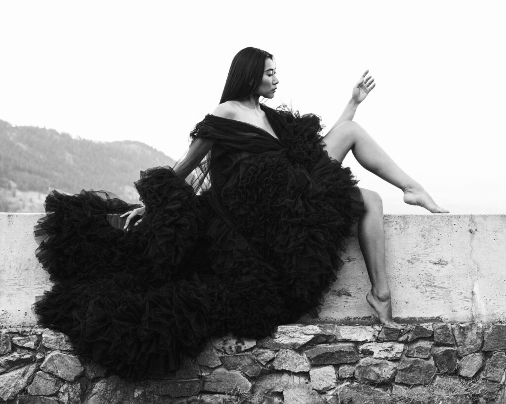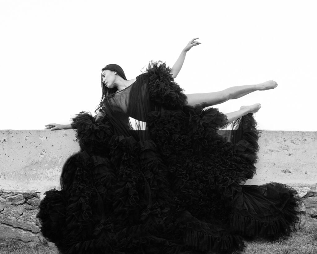 For added drama and sophistication, Julie donned a stunning black tulle gown that brilliantly stood out against the neutral cement wall backdrop, showcasing her talent beautifully.